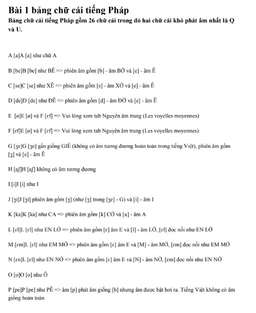 Hình 1: Bài 1 bảng chữ cái tiếng PhápBảng chữ cái tiếng Pháp gồm 26 chữ cái trong đó có hai chữ cái khó phát âm nhất là Q và