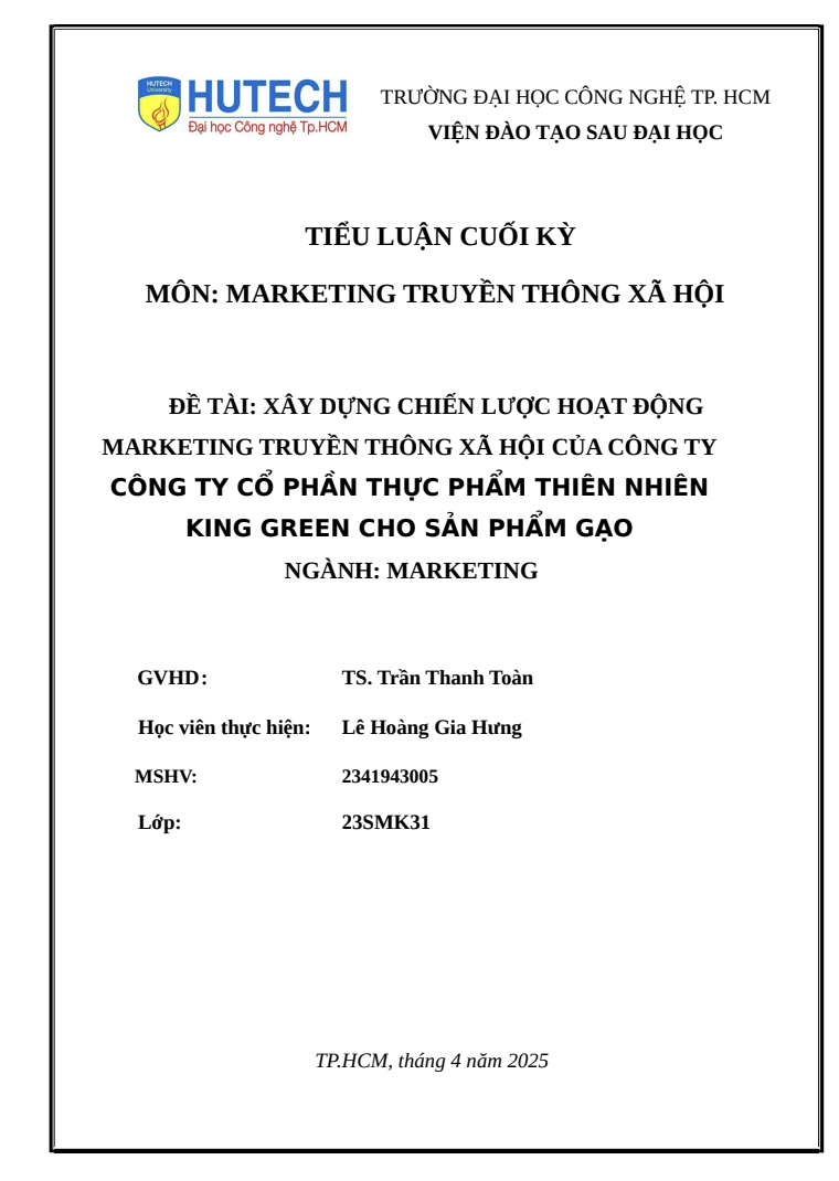 Tài liệu “Tiểu luận Marketing Truyền thông Xã hội – King Green” là báo cáo cuối kỳ của học viên Trường Đại học Công nghệ TP.HCM (HUTECH), ngành Marketing. Nội dung tập trung xây dựng chiến lược truyền thông xã hội (Social Media Marketing) cho Công ty Cổ phần Thực phẩm Thiên nhiên King Green với sản phẩm gạo, nhằm nâng cao độ nhận diện thương hiệu và mở rộng thị phần.
