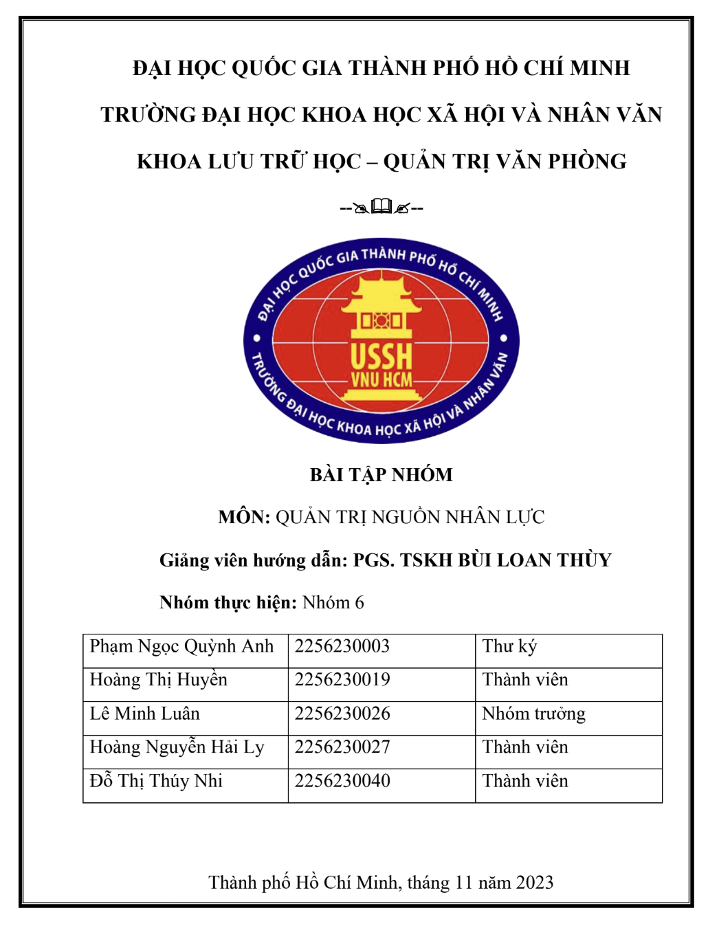 Đây là bài tập nhóm học phần Quản trị nguồn nhân lực của sinh viên Khoa Lưu trữ học – Quản trị văn phòng, Trường Đại học Khoa học Xã hội và Nhân văn – ĐHQG TP.HCM. Tài liệu được thực hiện bởi Nhóm 6 dưới sự hướng dẫn của PGS.TSKH Bùi Loan Thùy, với sự tham gia của 5 thành viên trong vai trò nhóm trưởng, thư ký và thành viên hỗ trợ.
