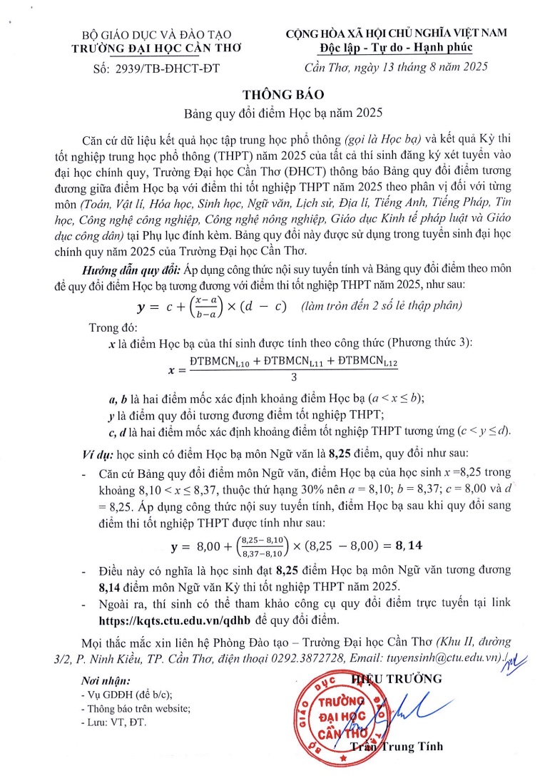 Ngày 13/8/2025, Trường Đại học Cần Thơ (ĐHCT) đã ban hành Thông báo số 2939/TB-ĐHCT-ĐT về Bảng quy đổi điểm Học bạ năm 2025. Đây là căn cứ quan trọng để thí sinh xét tuyển đại học chính quy, giúp chuyển đổi điểm Học bạ THPT sang điểm tương đương với kỳ thi tốt nghiệp THPT.