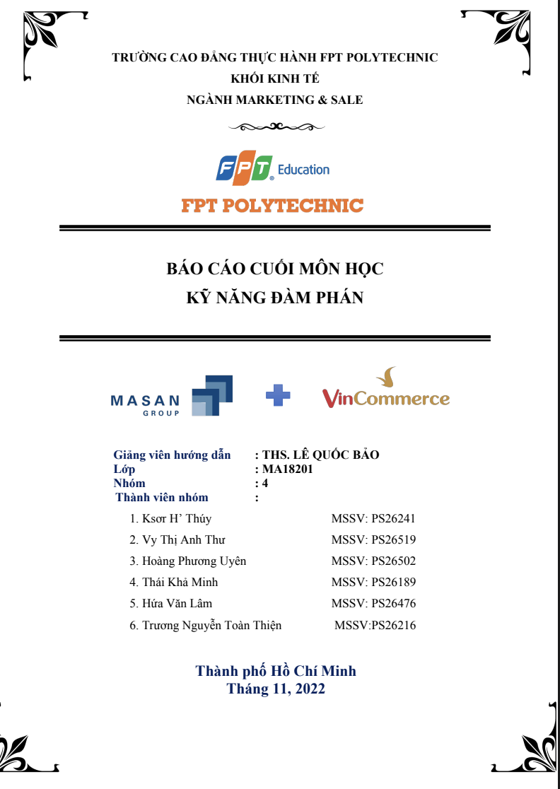 Tài liệu “ASM Kỹ năng Đàm phán – Masan & VinCommerce” là báo cáo cuối môn học Kỹ năng Đàm phán của sinh viên Trường Cao đẳng FPT Polytechnic, chuyên ngành Marketing & Sale. Báo cáo tập trung phân tích và áp dụng các kỹ thuật đàm phán trong bối cảnh thực tiễn, với ví dụ cụ thể từ hai thương hiệu lớn tại Việt Nam: Masan GroupVinCommerce.