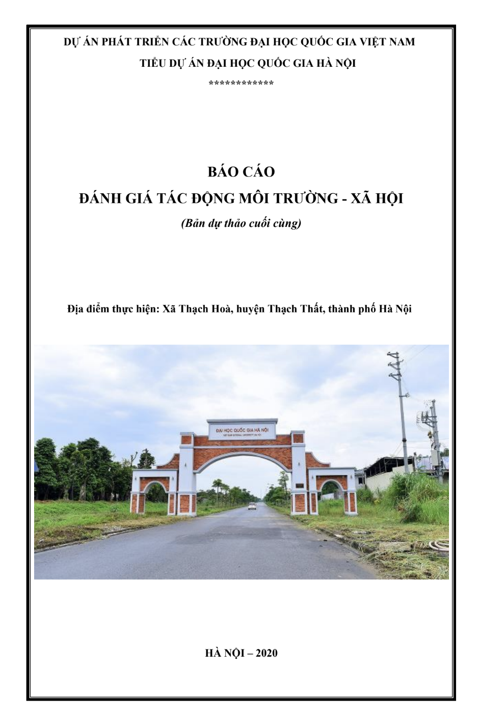 Tài liệu này là Báo cáo đánh giá tác động môi trường – xã hội (ĐTM-XH) thuộc Dự án phát triển các trường Đại học Quốc gia Việt Nam, cụ thể là Tiểu dự án Đại học Quốc gia Hà Nội tại địa bàn xã Thạch Hòa, huyện Thạch Thất, Hà Nội. Đây là bản dự thảo cuối cùng được hoàn thiện vào năm 2020.
