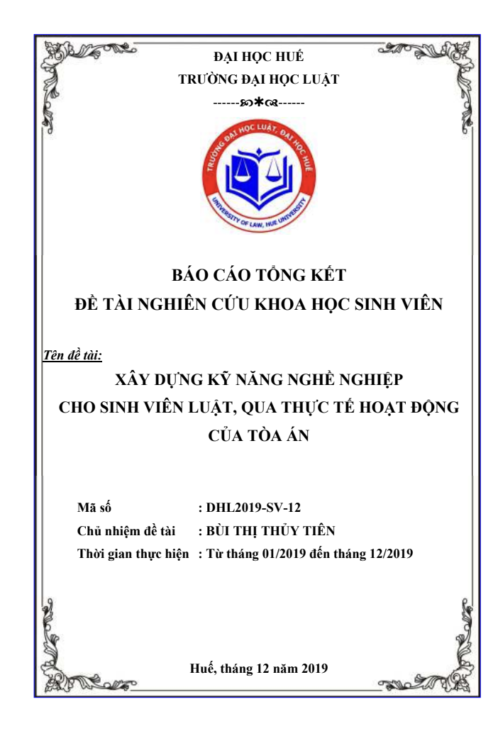 Đây là báo cáo tổng kết đề tài nghiên cứu khoa học sinh viên của Trường Đại học Luật – Đại học Huế, thực hiện trong năm 2019. Đề tài có tên: “Xây dựng kỹ năng nghề nghiệp cho sinh viên Luật, qua thực tế hoạt động của Tòa án”, do sinh viên Bùi Thị Thùy Tiên chủ nhiệm.