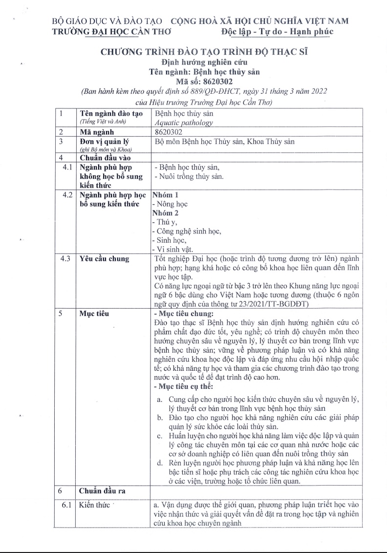 Tải tài liệu c\CHƯƠNG TRÌNH ĐÀO TẠO TRÌNH ĐỘ THẠC SĨ NGÀNH BỆNH HỌC THỦY SẢN – ĐẠI HỌC CẦN THƠ tại đây :https://drive.google.com/file/d/1qxQHNadOcLc08R0gx1TW27JzeNl8zrib/view