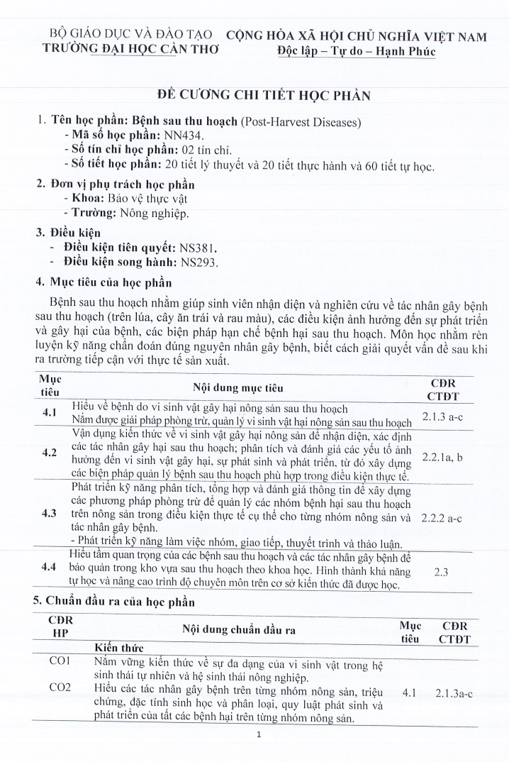 ĐẠI HỌC CẦN THƠ - ĐỀ CƯƠNG CHI TIẾT HỌC PHẦN BỆNH SAU THU HOẠCH (NN434) trang 1