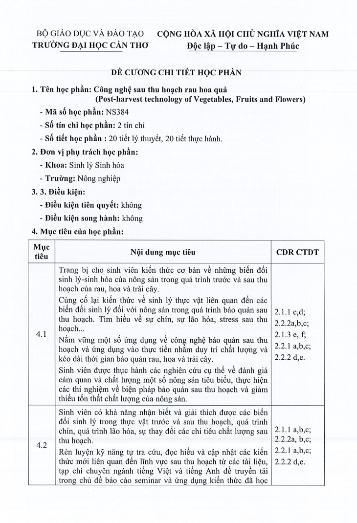 Tài liệu Đề cương chi tiết học phần Công nghệ sau thu hoạch rau hoa quả (NS384) của Trường Đại học Cần Thơ mang đến hệ thống kiến thức quan trọng về biến đổi sinh lý – sinh hóa trong quá trình thu hoạch và bảo quản rau, hoa, trái cây. Sinh viên sẽ được trang bị lý thuyết cơ bản, đồng thời thực hành nghiên cứu các yếu tố ảnh hưởng đến chất lượng nông sản sau thu hoạch. Đây là nguồn tài liệu hữu ích cho sinh viên ngành Sinh lý – Sinh hóa, Nông nghiệp và Công nghệ sau thu hoạch, giúp rèn luyện kỹ năng phân tích, đánh giá, và áp dụng các biện pháp bảo quản hiệu quả. Hãy tải ngay bản PDF chính thức để học tập, nghiên cứu và ứng dụng trong thực tế.