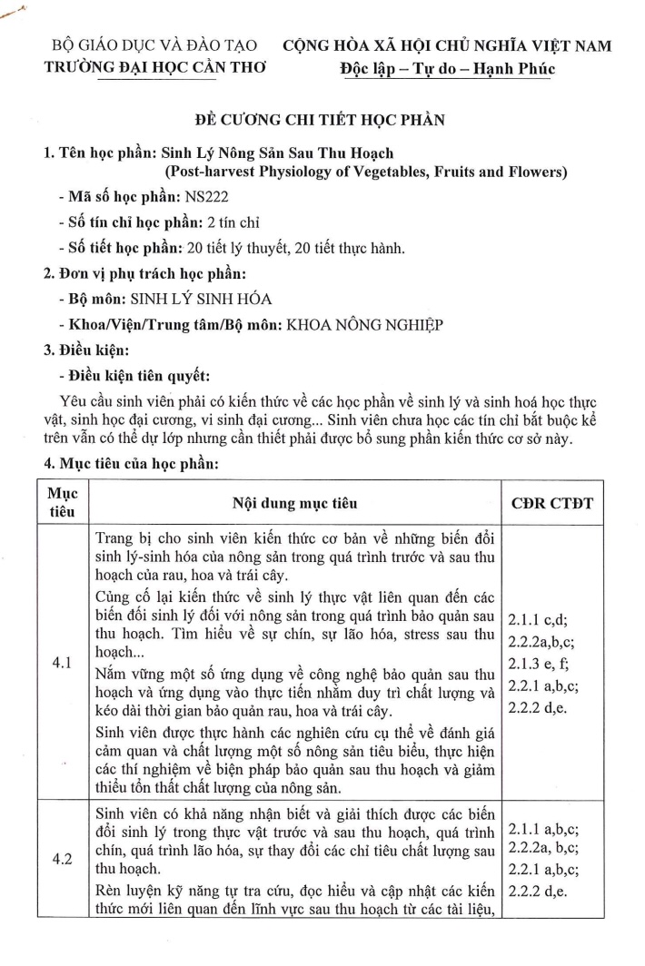 ĐẠI HỌC CẦN THƠ – ĐỀ CƯƠNG CHI TIẾT HỌC PHẦN SINH LÝ NÔNG SẢN SAU THU HOẠCH (NS222)