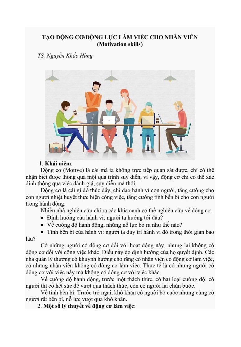TÀI LIỆU Tạo động cơ/động lực làm việc cho nhân viên (Motivation skills) của TS. Nguyễn Khắc Hùng cung cấp kiến thức nền tảng và ứng dụng thực tiễn về cách thúc đẩy tinh thần làm việc. Nội dung tài liệu giải thích khái niệm động cơ, phân tích các yếu tố ảnh hưởng đến hành vi lao động, đồng thời giới thiệu nhiều học thuyết nổi bật về tạo động lực.