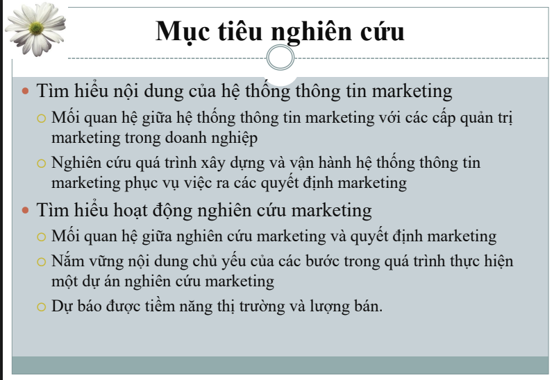 Nội dung chương trình đề cập đến các thành phần quan trọng như: ghi chép nội bộ, tình báo marketing, nghiên cứu thị trường và hệ thống phân tích thông tin. Ngoài ra, tài liệu cũng nhấn mạnh vai trò của nghiên cứu marketing trong việc xác định nhu cầu khách hàng, dự báo xu hướng, đánh giá môi trường cạnh tranh và hỗ trợ doanh nghiệp hoạch định chiến lược hiệu quả.